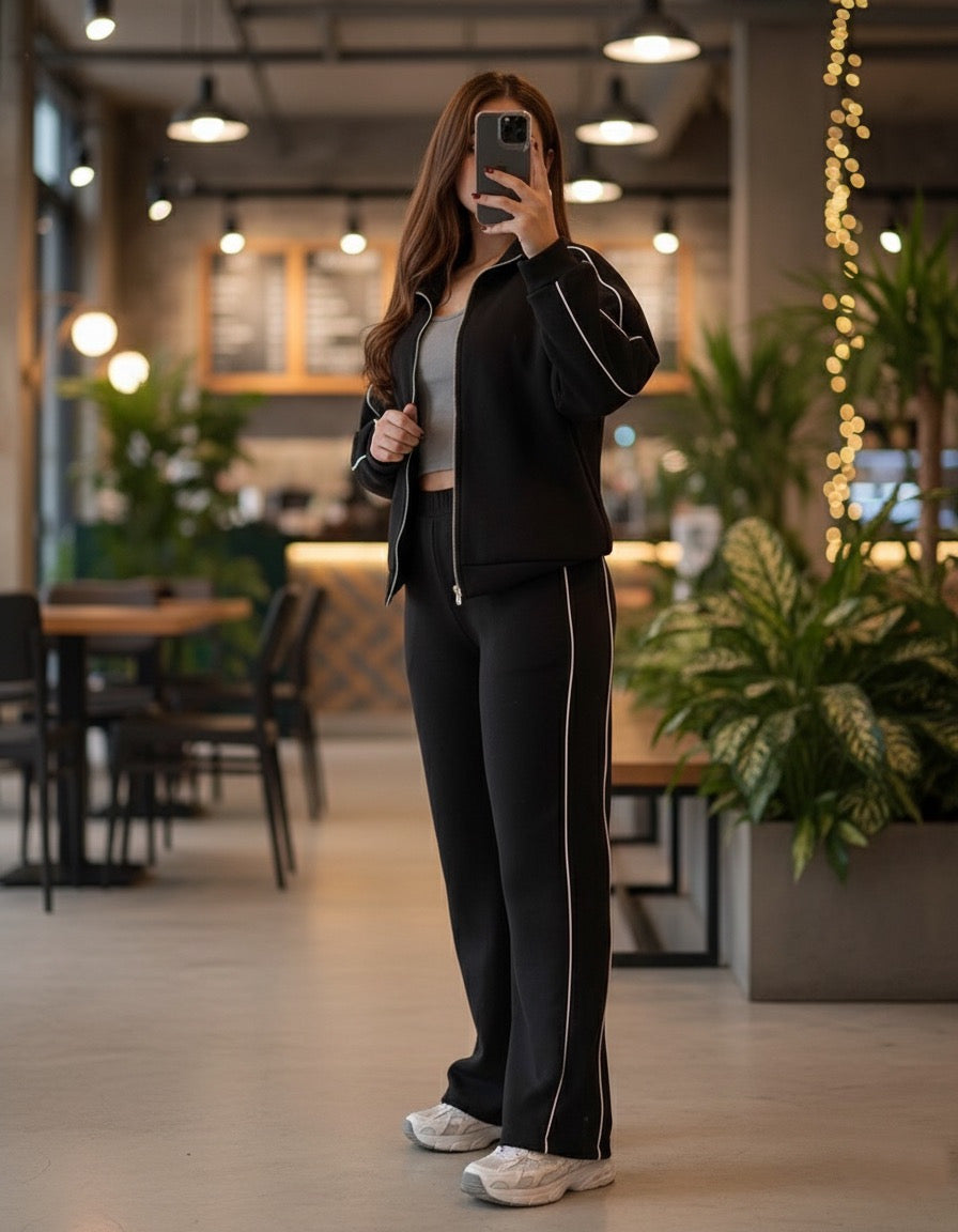 Stay cozy in style this winter! Two-piece Milton imported set with a smooth zipper jacket and matching pants. Designed with elegant ribbed cuffs and hems for a perfect fit. Soft, warm, and built for all-day comfort. Your go-to outfit for effortless winter vibes.
