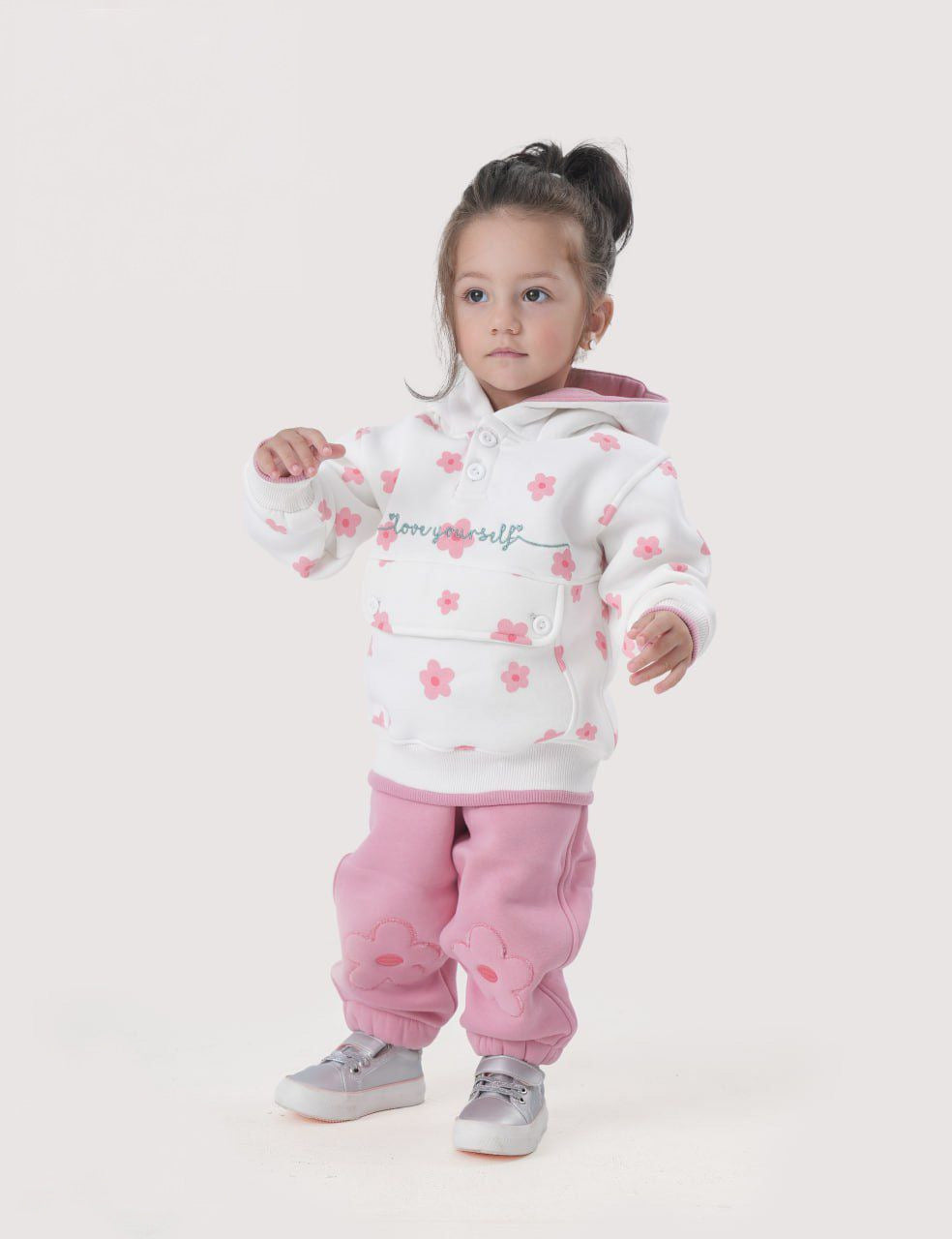 Let her bloom in comfort and style with this charming girls’ set, crafted from premium Milton cotton that’s fully lined and treated to resist pilling. Designed for cooler days and active play, the hoodie features a soft floral print with cheerful “Flower Power” embroidery, while the matching pants add a playful touch with delicate flower accents near the knees. The fabric offers a smooth, cozy feel that stays fresh and vibrant wash after wash. Whether she’s heading to school, a playdate, or a weekend outing, this outfit blends everyday practicality with a sweet, expressive look.