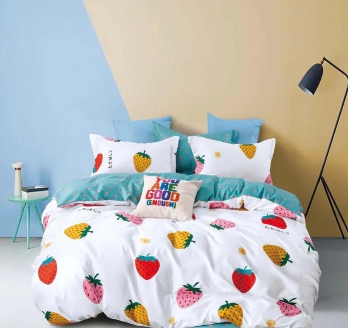 أضيفي لمسة من الحيوية والمرح إلى غرفة نومك مع طقم اللحاف "فراولة مرحة"، المصمم برسومات فواكه ملونة وزهور صغيرة على خلفية بيضاء ناعمة. هذا الطقم مثالي للأجواء الشبابية، ويمنحك إحساسًا بالانتعاش والبهجة كل صباح