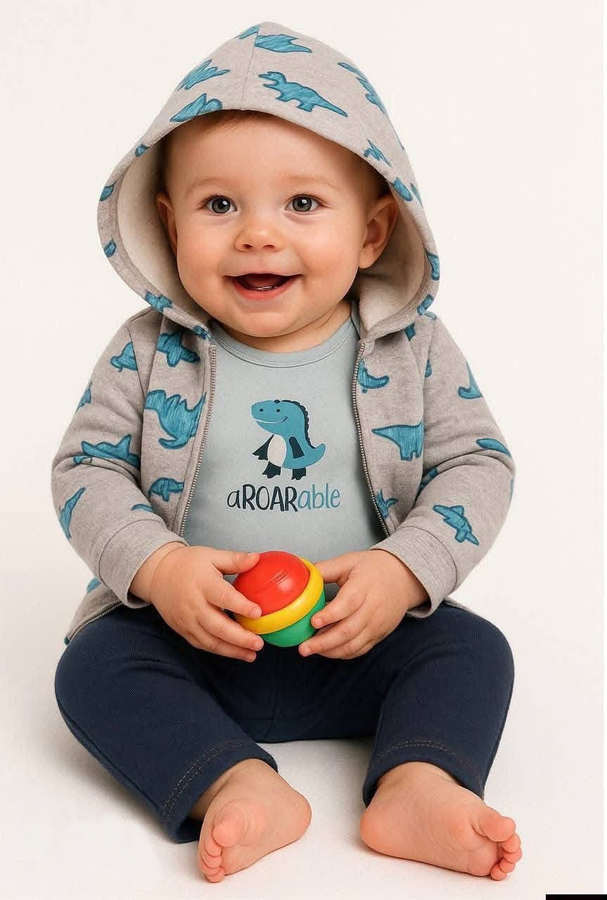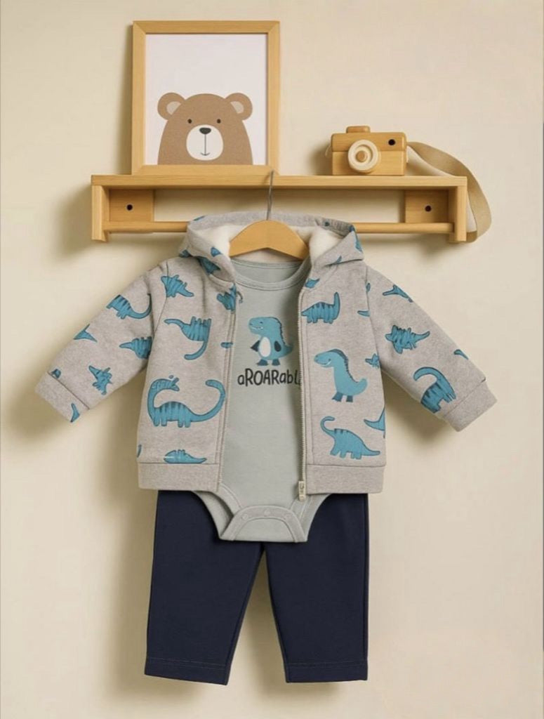 Keep your little adventurer warm and stylish this season with our boys’ winter outfit, crafted from premium melton cotton for a soft, insulated feel. This three-piece set includes a light grey hoodie with playful blue dinosaur prints, a light blue long-sleeve shirt featuring a cheerful “aROARable” dinosaur graphic, and dark blue pants for a balanced, sporty look. The melton cotton fabric offers excellent warmth and durability, making it ideal for cold-weather outings, school days, or cozy indoor play. Designed for comfort and movement, this outfit combines fun design with practical winter layering.