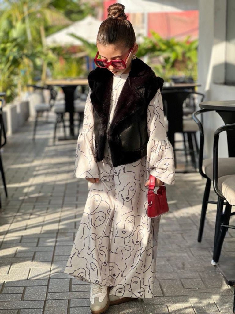 A black faux fur vest adds cozy texture and bold contrast to the look. The long dress showcases an artistic abstract face print, blending creativity with fashion. Paired with a soft cotton undershirt for added comfort and layering warmth. Accessories like sunglasses and a mini handbag complete the chic winter vibe. Ideal for café visits, winter strolls, or fashion-forward photoshoots.