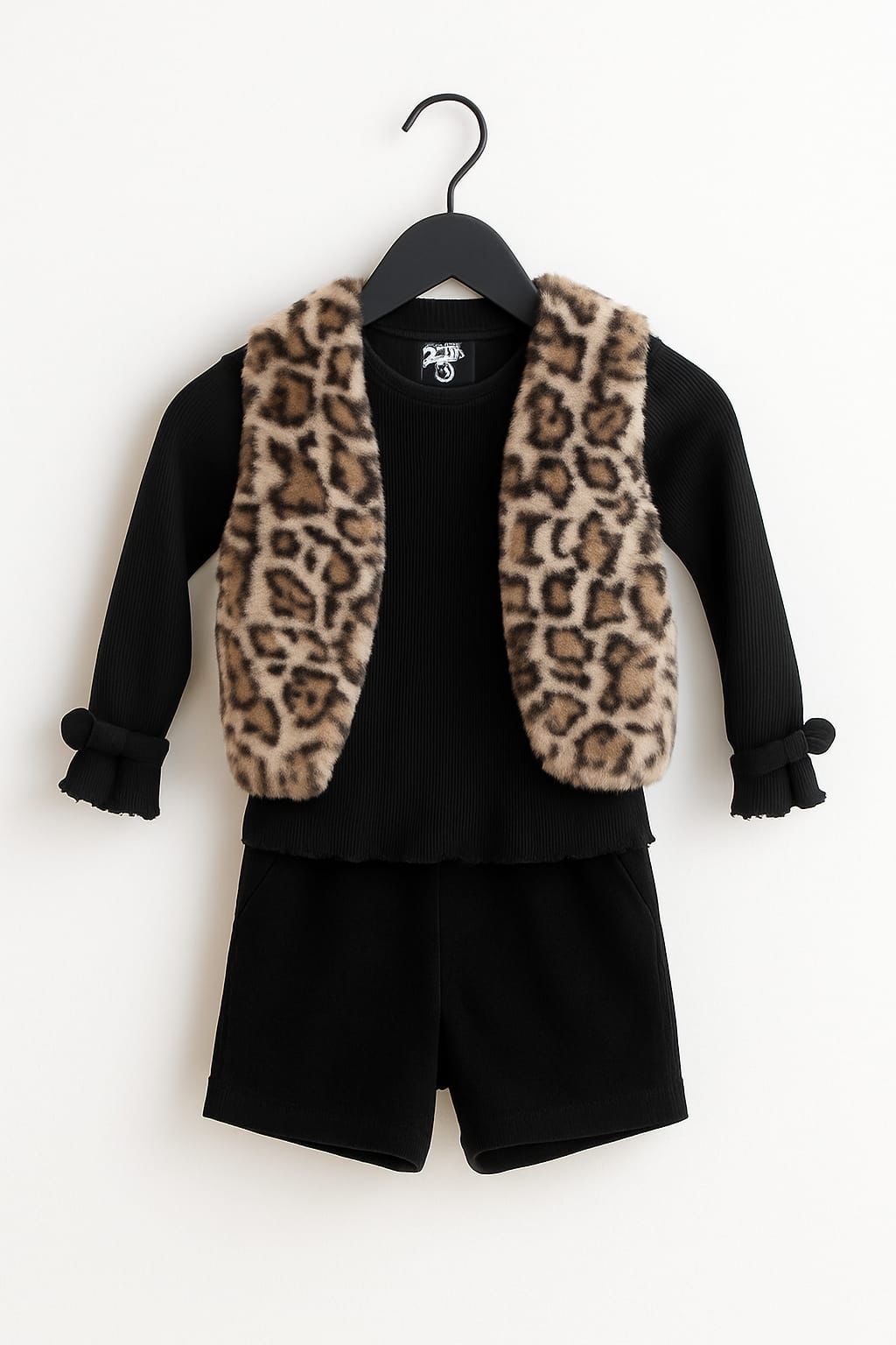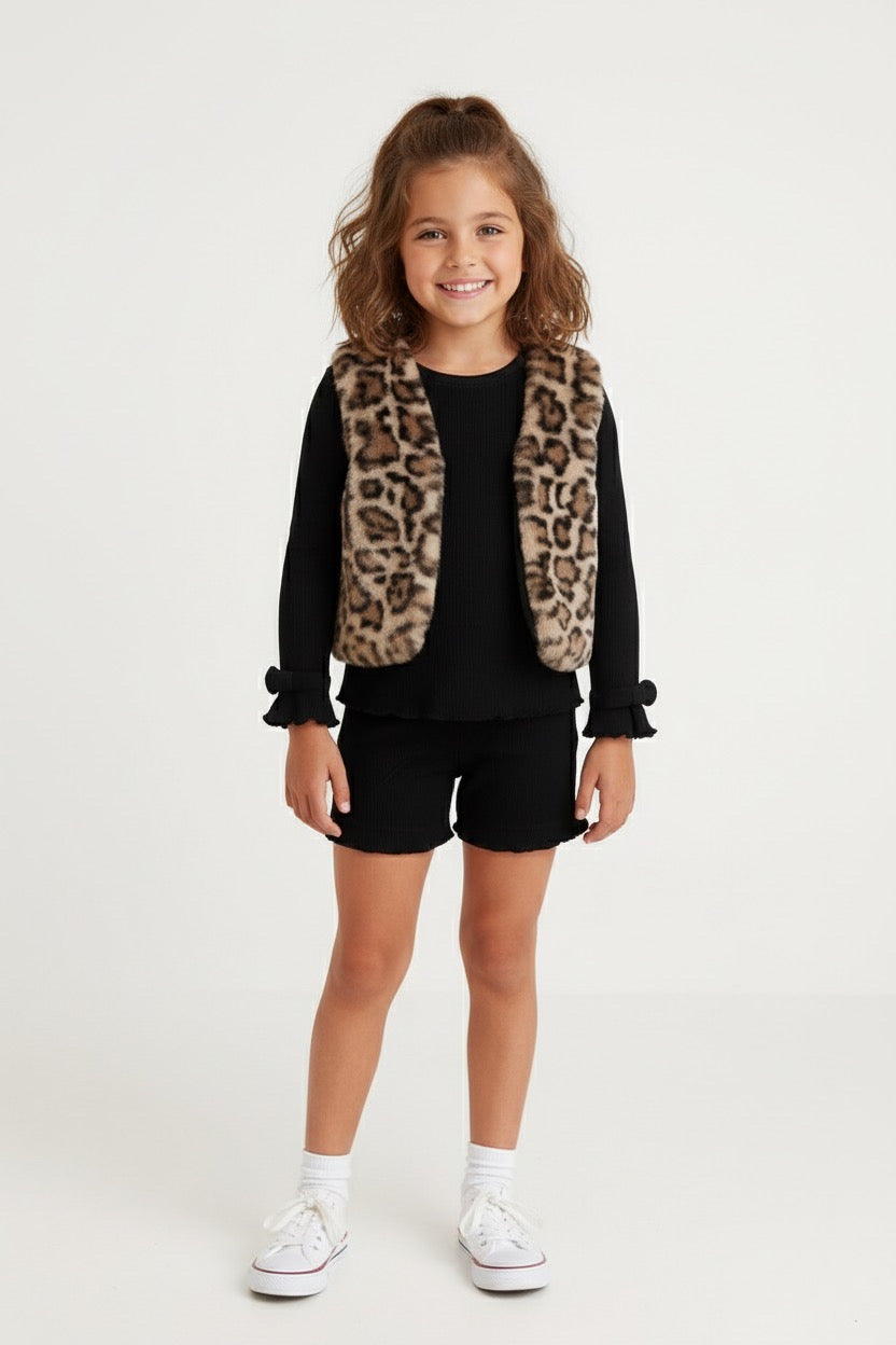 Keep her cute and stylish with our 3-piece girls’ outfit: long-sleeve top, shorts, and a cozy tiger-fur vest. The sleeves feature adorable bow details for an extra girly touch. Soft, warm, and perfect for outings, parties, and winter photos. Comfortable fit with a trendy wild-style flair. A must-have set for fashionable little girls!