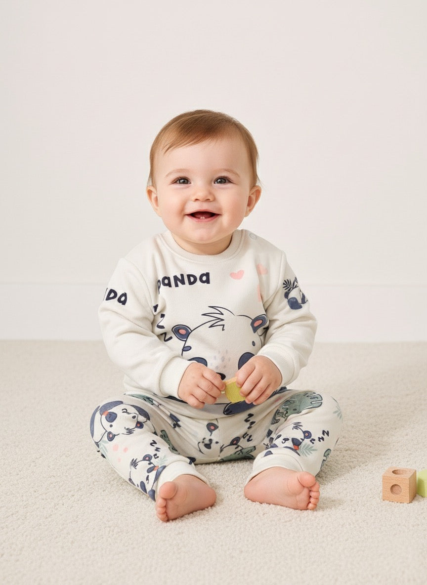 Wrap your little one in cozy charm with this adorable unisex baby set, crafted from premium winter velvet fur for extra softness and warmth. Designed for both boys and girls, the outfit features a cheerful panda-themed top with matching pants, both decorated with friendly cartoon prints that spark joy and imagination. The plush fabric feels gentle against delicate skin, while the breathable lining ensures comfort throughout the day—whether they’re crawling, playing, or snuggling indoors. This set is ideal for winter days filled with laughter, movement, and cuddles.
