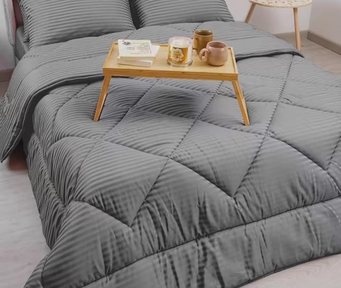 ابدأ يومك بأجواء من الراحة والسكينة مع طقم اللحاف الرمادي المصمم بخطوط سترايب أنيقة ولمسة مبطنة تمنحك إحساسًا بالدفء والاحتضان. يجمع هذا الطقم بين البساطة والعملية، ليضفي على غرفتك طابعًا عصريًا مريحًا