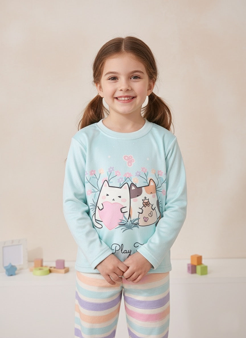 Wrap your little one in cozy charm with this winter-ready girls’ pajama set. Made from ultra-soft velour fabric, it offers warmth and comfort for chilly nights. The playful cat illustration and pastel-striped pants add a touch of fun and sweetness to bedtime. Designed for both style and snuggly relaxation, it’s perfect for lounging or drifting off to sleep. A delightful blend of comfort and cuteness for the season.