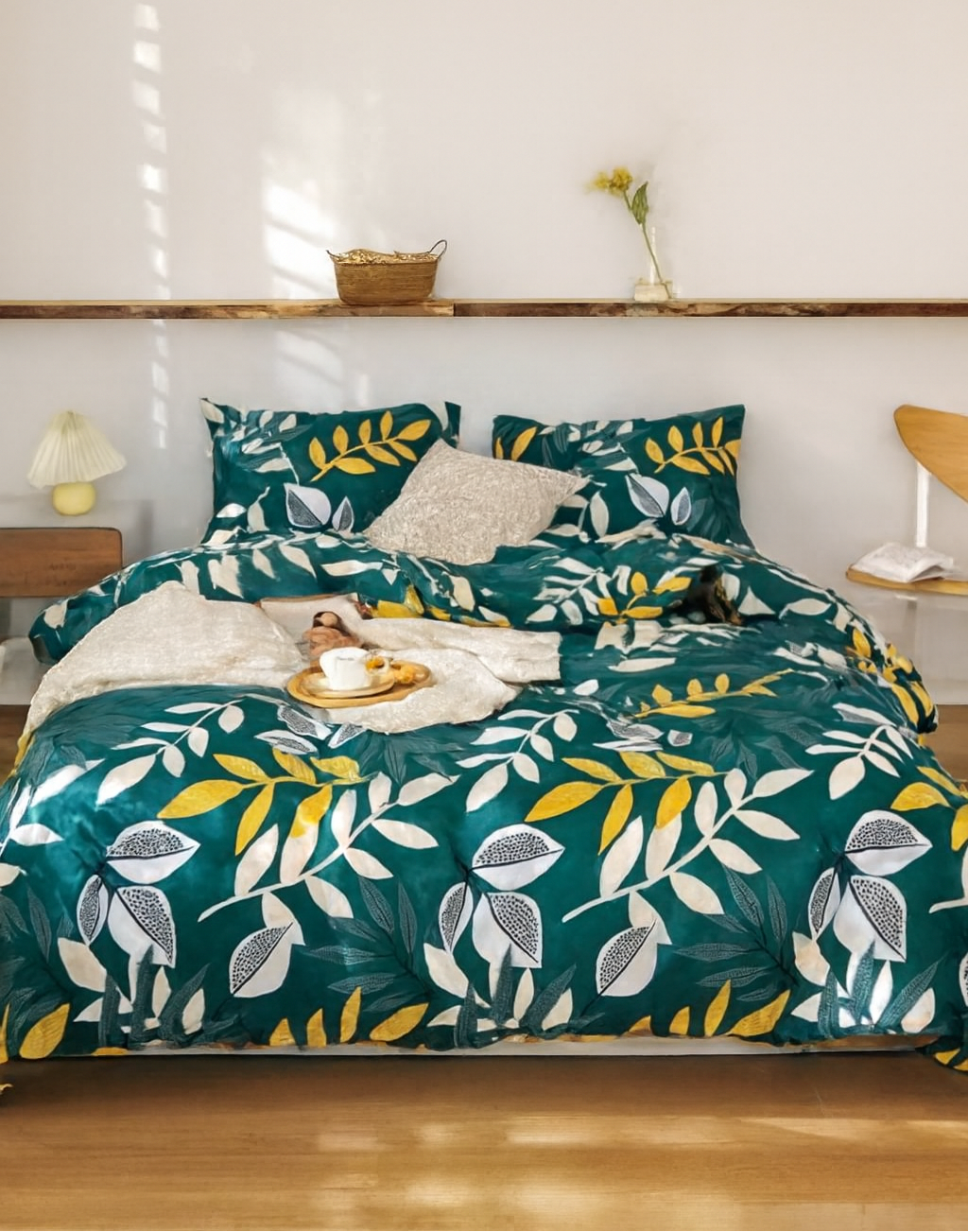 استمتع بأجواء من الدفء والهدوء مع طقم اللحاف "ظل الغابة"، المصمم بنقوش أوراق طبيعية تضفي لمسة من العمق والأناقة على غرفة نومك. هذا الطقم يجمع بين الراحة والتصميم الجذاب، ليمنحك تجربة نوم مريحة وسط أجواء مستوحاة من الطبيعة