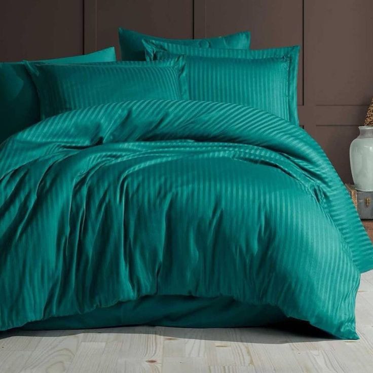 امنح غرفتك لمسة من الدفء والفخامة مع طقم اللحاف الشتوي المصمم بلون فيروزي أنيق ونقشة ستريب ناعمة تضيف عمقًا بصريًا راقيًا. مصنوع من خامات عالية الجودة تمنحك إحساسًا بالنعومة والراحة طوال ليالي الشتاء الباردة